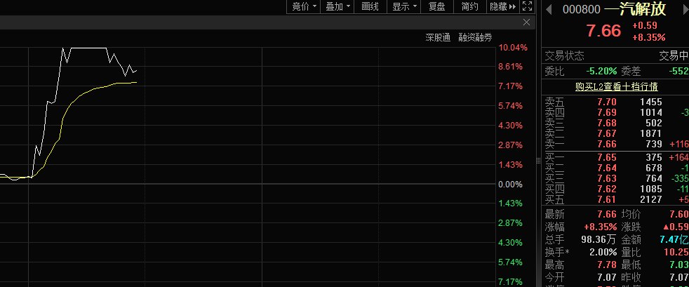 8月20日午后,一汽解放(000800)股价突然大幅拉升,10分钟内由涨幅不到1%,拉升至涨停板,盘中涨停板封单一度超过50万手。随后,该股涨停板被打开。