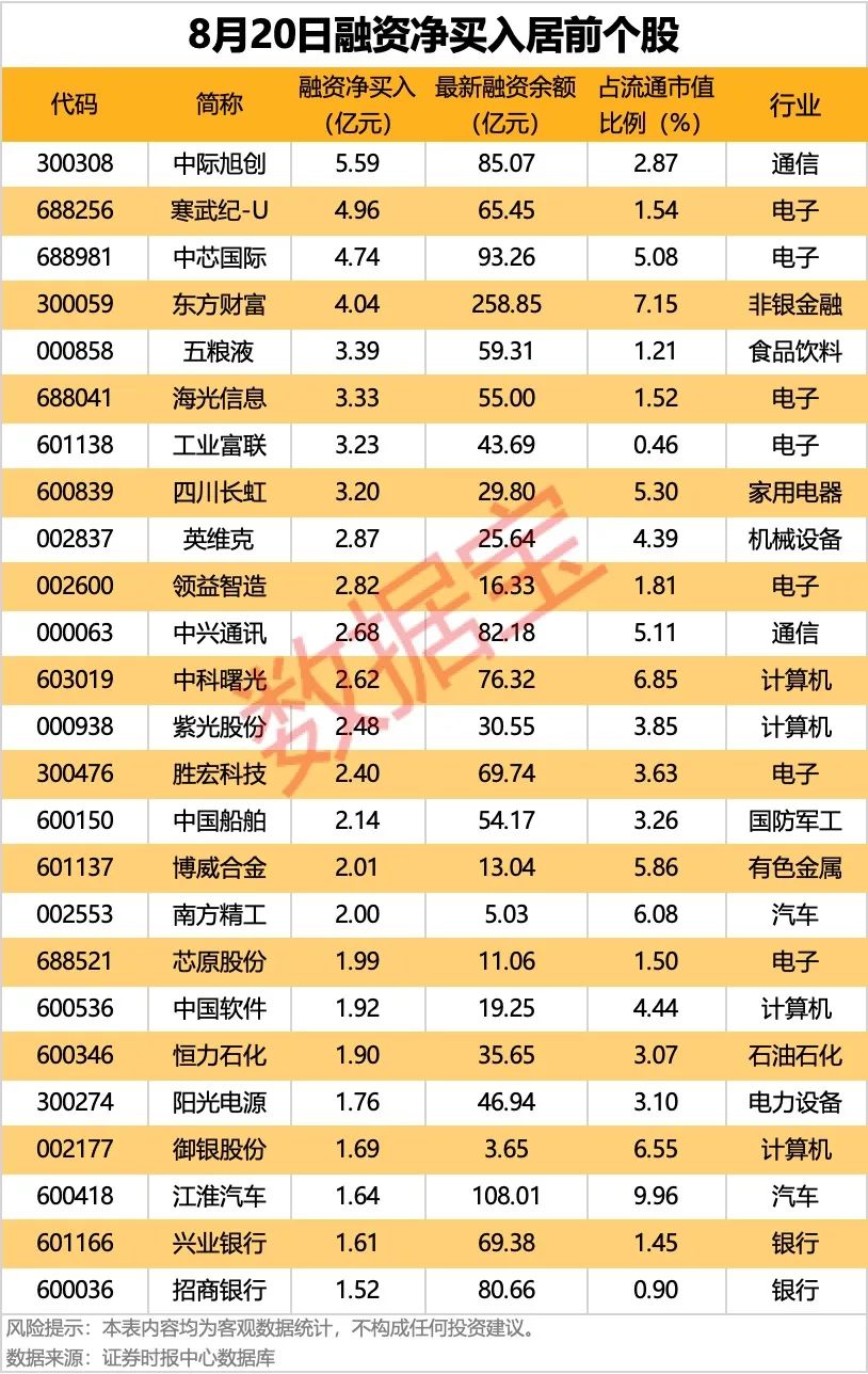 具体到个股,8月20日获融资净买入在1亿元以上的有55股。中际旭创融资净买入额居首,当日净买入5.59亿元;其次是寒武纪-U、中芯国际,融资净买入金额分别为4.96亿元、4.74亿元。融资净买入金额居前的还有东方财富、五粮液、海光信息等。