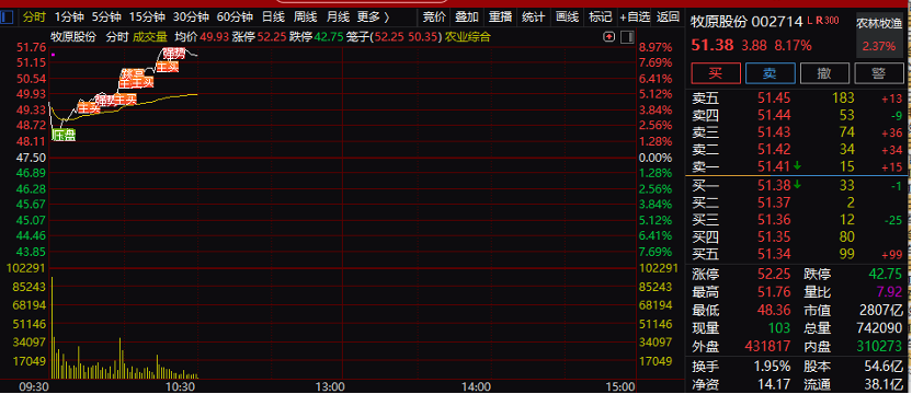 养殖业板块走强,牧原股份早盘一度大涨近9%,永顺生物、神农集团、晓鸣股份、温氏股份等均涨超3%。