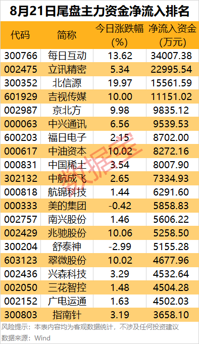 4股尾盘获主力资金大幅抢筹均超1亿元,其中每日互动尾盘净流入金额超3亿元,立讯精密尾盘净流入2.3亿元,北信源和吉视传媒涨停。