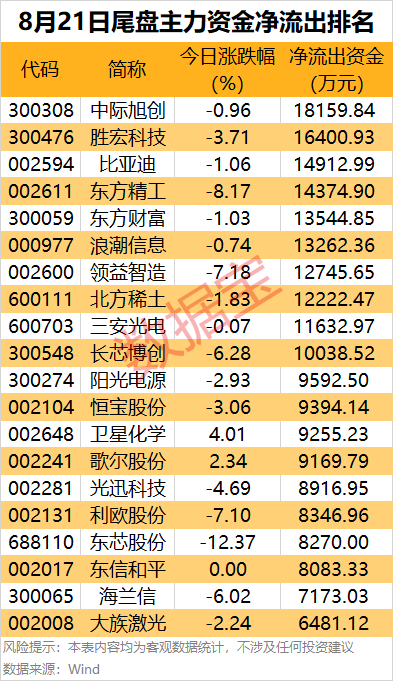 中际旭创尾盘主力资金净流出1.82亿元,居首;胜宏科技、比亚迪、东方精工和东方财富等尾盘净流出金额居前。
