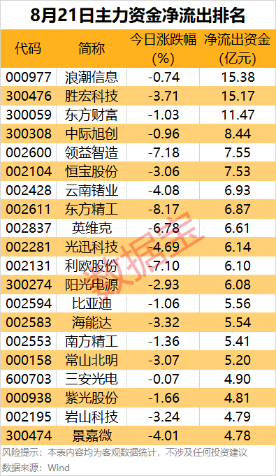 3只龙头股主力资金净流出均超10亿元,其中浪潮信息主力资金净流出15.38亿元,居首。胜宏科技和东方财富主力资金分别净流出15.17亿元、11.47亿元。