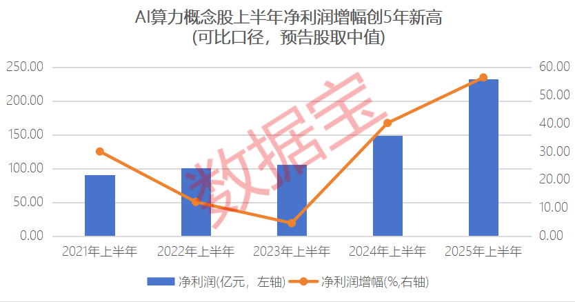 根据数据,已披露2025年半年报(业绩预告股取中值)的公司,按照可比口径计算,今年上半年AI算力概念股净利润同比增长56.27%,创近5年同期最高水平。