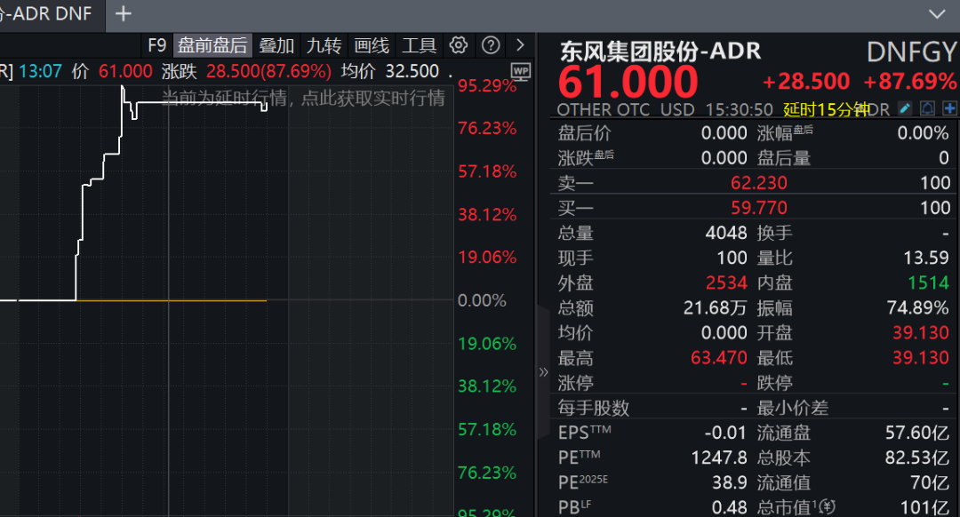 港股公告发布后,美股东风集团股份ADR一个小时内暴涨超91%,收盘涨近88%,报收61美元。