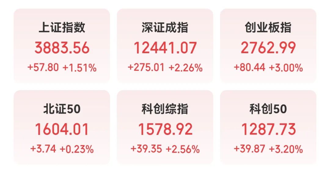 截至收盘,上证指数涨1.51%,深证成指涨2.26%,创业板指涨3%。