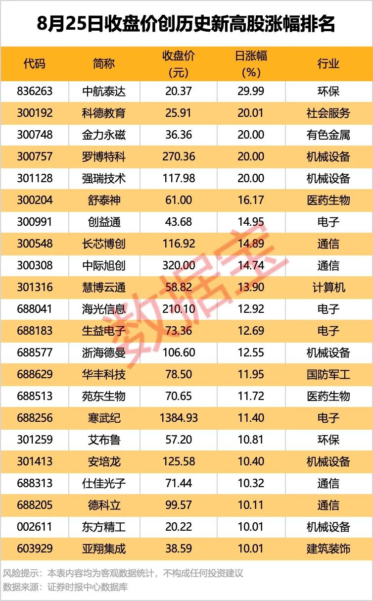 收盘价创历史新高股中,今日股价平均上涨6.88%,涨停的有中航泰达、科德教育、金力永磁等。