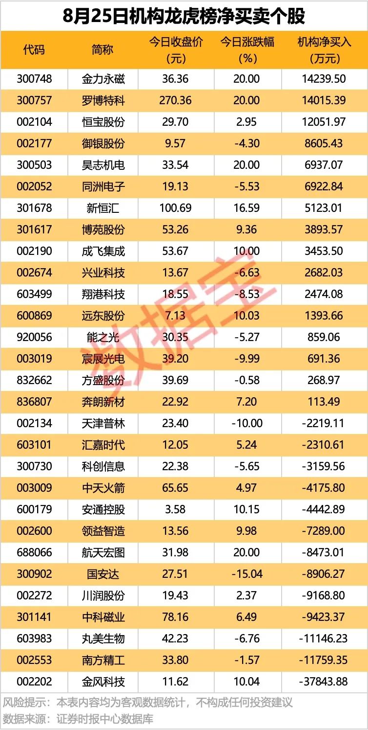 今日龙虎榜中,净买入的个股16只,净卖出的个股13只。12股净买入金额均超千万元,金力永磁获机构净买入1.42亿元,居首;其次是罗博特科、恒宝股份、御银股份,获净买入均超8600万元。