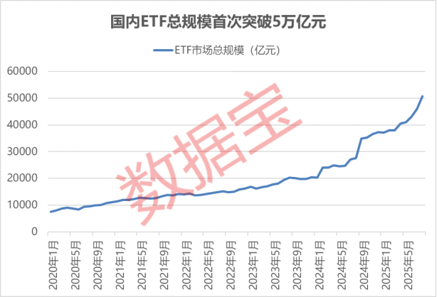 值得注意的是,国内ETF总规模的增长步伐显著加快。2020年10月,国内ETF总规模首次突破万亿元大关,到2023年8月首次突破2万亿元,历时近三年;而到2024年9月突破3万亿元,时间已缩短至一年左右;2025年4月进一步突破4万亿元,仅用了约半年;而从4万亿元到5万亿元更是只经历了四个多月。这一连续加速的进程,清晰显示出我国指数化投资正进入快速发展轨道。