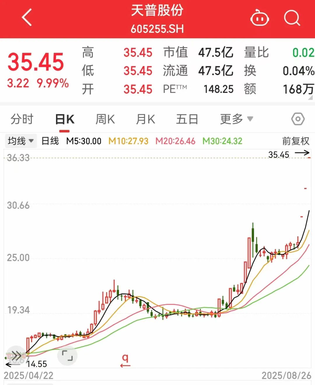 天普股份8月22日换手率仅为0.28%,8月25日换手率进一步降低至0.14%,今天换手率再度降至0.04%。