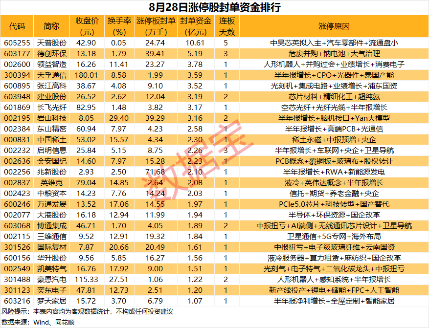 以封单金额计算,26股封单资金均超1亿元,天普股份、德创环保、领益智造封单资金居前,分别为10.61亿元、5.19亿元、3.78亿元。