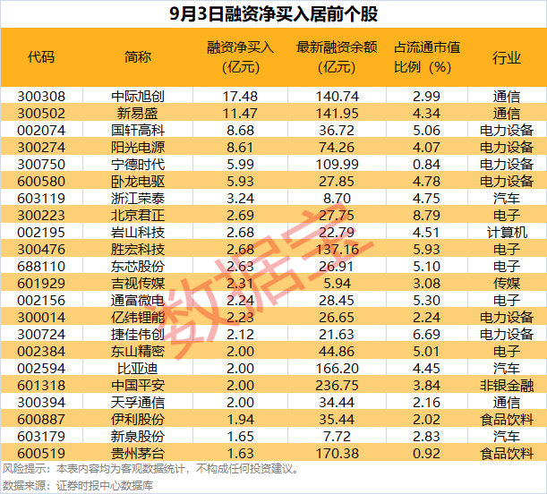 具体到个股,9月3日获融资净买入千万元以上的有475股,其中37股获融资净买入均超1亿元。中际旭创融资净买入额居首,当日净买入17.48亿元,其次是新易盛、国轩高科,融资净买入金额分别为11.47亿元、8.68亿元,融资净买入金额居前的还有阳光电源、宁德时代、卧龙电驱等。
