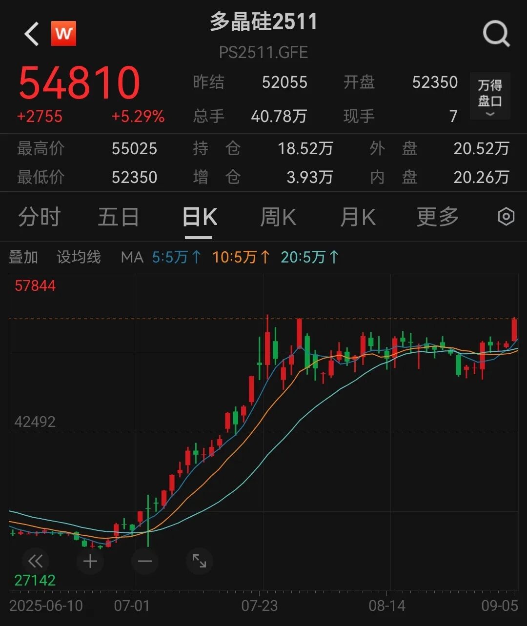 早盘,多晶硅主力合约开盘后持续拉升,盘中最高上涨5.71%,报5.5万元/吨,午间收盘上涨5.29%,报5.48万元/吨。6月26日以来,多晶硅主力合约连涨1个月,近期价格震荡走势,今日再度走高,盘中创8月以来新高,较年内低点上涨85.55%。