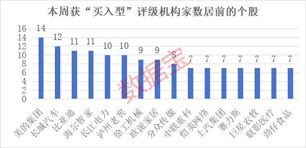 本周有51只个股获得5家及以上机构重点关注,关注机构家数居前的个股以大盘股为主。美的集团、长城汽车位居前两名,分别有14家、12家机构给予“买入型”评级;另外,比亚迪、海尔智家、长江电力、泸州老窖均获得10家及以上机构给予“买入型”评级。