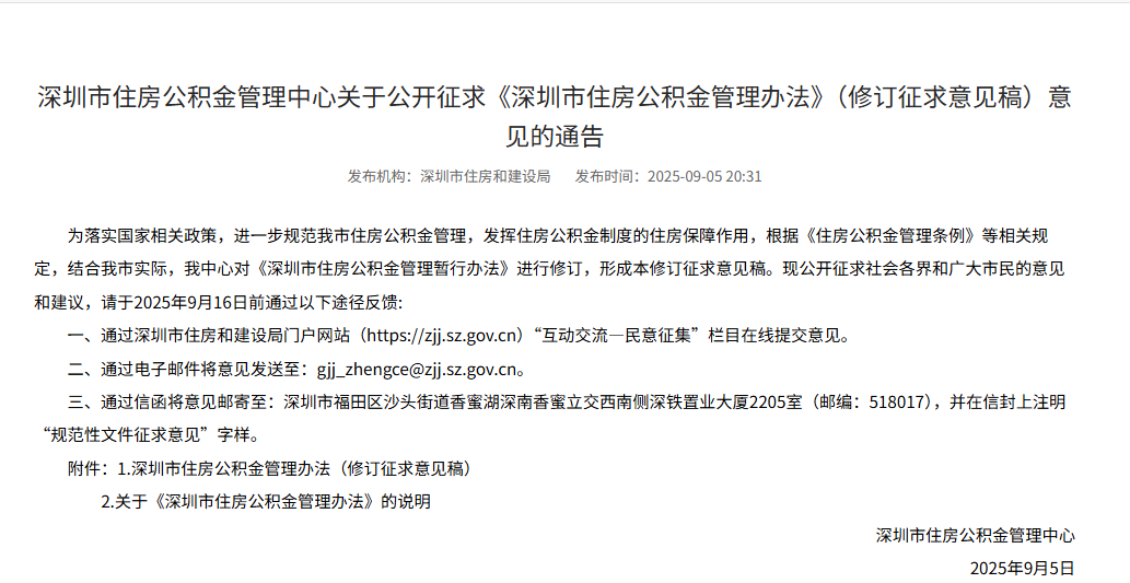 9月5日,记者从深圳市住建局网站获悉,《深圳市住房和建设局 中国人民银行深圳市分行关于进一步优化调整深圳市房地产政策措施的通知》正式发布,《通知》自2025年9月6日(周六)起施行。