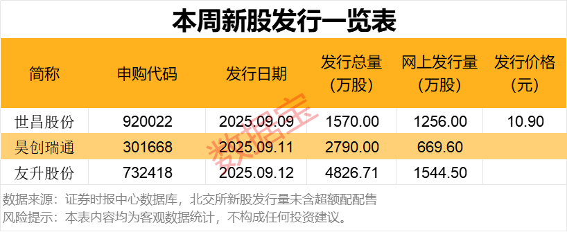 根据发行安排,本周暂有3只新股申购,本周二可申购世昌股份,本周四可申购昊创瑞通,本周五可申购友升股份。
