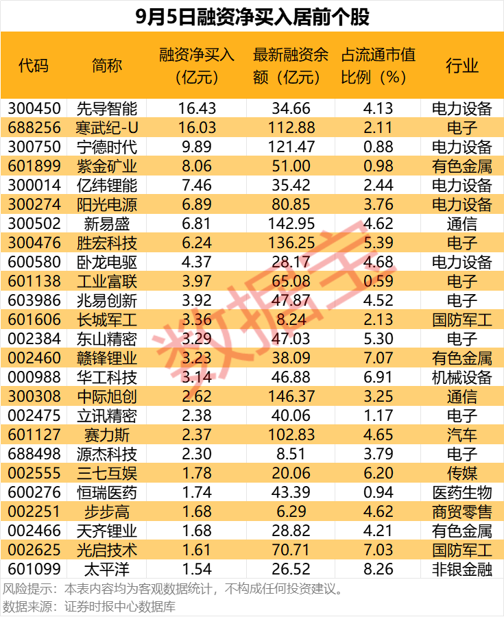 具体到个股,9月5日获融资净买入千万元以上的有467只,其中38只融资净买入额超亿元。先导智能融资净买入额居首,当日净买入16.43亿元,其次是寒武纪-U、宁德时代,融资净买入金额分别为16.03亿元、9.89亿元,融资净买入金额居前的还有紫金矿业、亿纬锂能、阳光电源等。