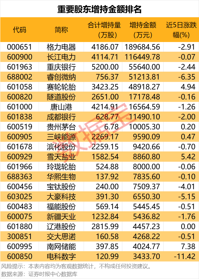 从增持金额看,近5日增持金额在亿元以上的有9家,增持金额最多的是格力电器,其间累计增持4186.07万股,增持金额合计18.97亿元;其次是长江电力,增持量为4114.71万股,增持金额11.64亿元;重庆银行近5日获股东增持5.56亿元,增持金额位居第三。