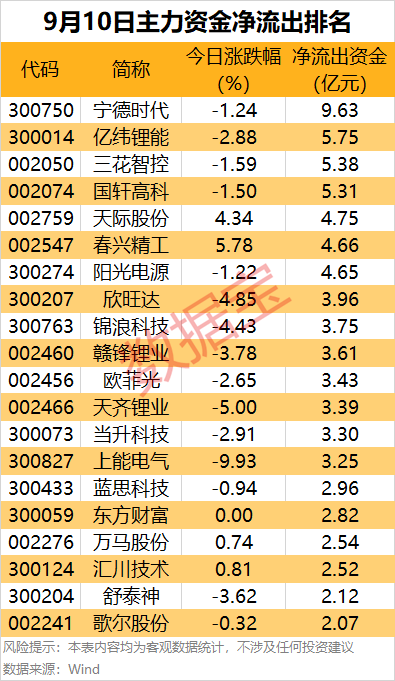 两只锂电股主力资金净流出金额居前,宁德时代净流出9.63亿元,居首,股价下跌1.24%;亿纬锂能跌2.88%,主力资金净流出5.75亿元。