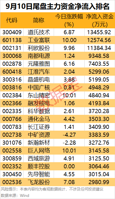 此外,还有工业富联、利欧股份、南都电源、元隆雅图、江淮汽车等尾盘主力资金净流入金额居前。