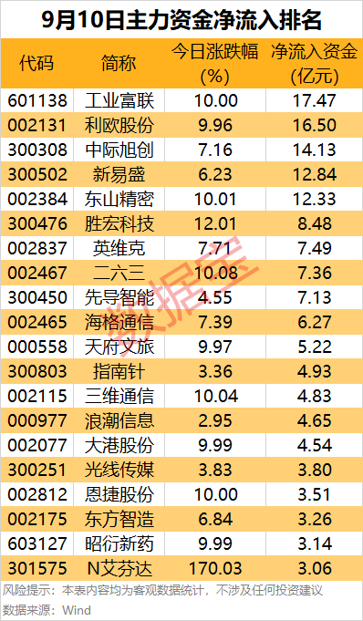 “果链”龙头股工业富联主力资金净流入17.47亿元,居首,净流入额创2025年1月22日以来新高,股价涨停。消息面上,北京时间9月10日,苹果正式召开秋季新品发布会,正式发布iPhone 17系列、全新机型iPhone Air,同时还带来了耳机、手表等新品。