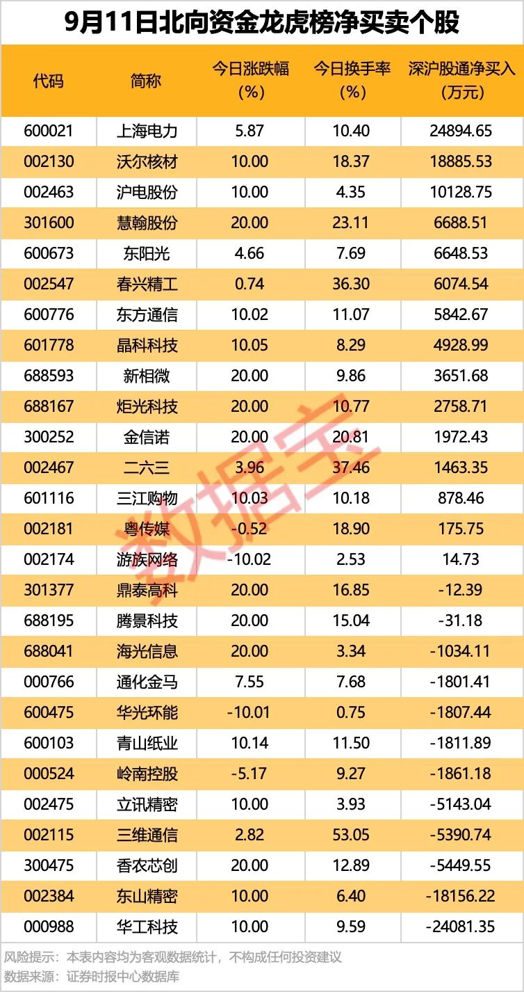 今日龙虎榜现身个股中,15股获北向资金净买入。净买入居首的是上海电力,金额为2.49亿元;沃尔核材、沪电股份、慧翰股份分别获净买入1.89亿元、1.01亿元、6688.51万元。