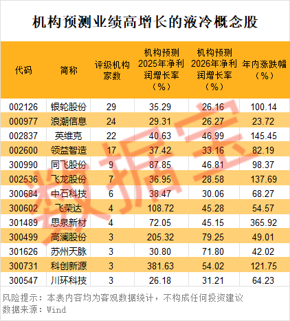 上述15股中,机构预测2025年、2026年净利润增幅均超20%的有13只,科创新源、高澜股份、飞荣达2025年净利润增幅均有望超100%。科创新源主要通过创源智热开展数据中心散热结构件业务,产品包括虹吸式特种散热模组、液冷板等。
