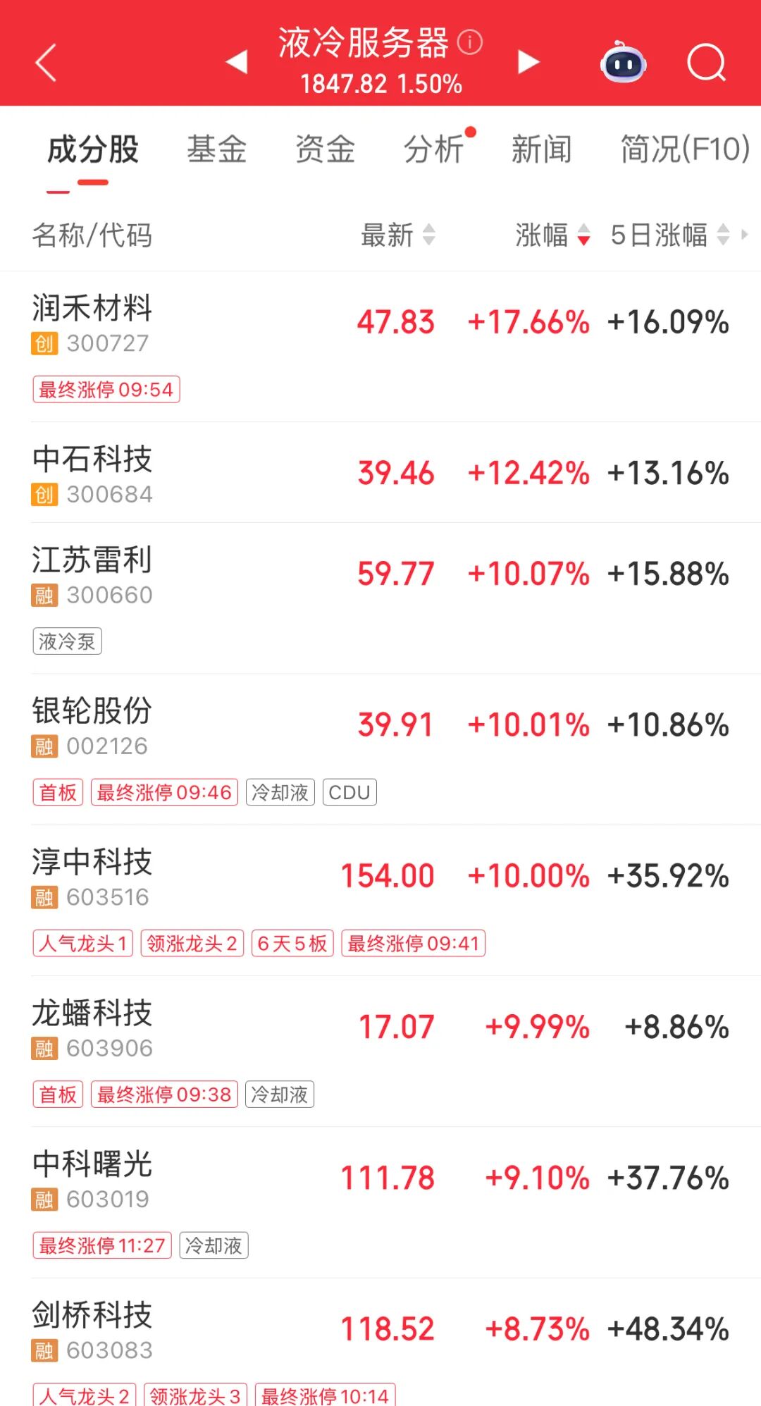 此外,液冷板块中,还有银轮股份、龙蟠科技涨停,润禾材料涨超17%,中石科技、江苏雷利、中科曙光等跟涨。