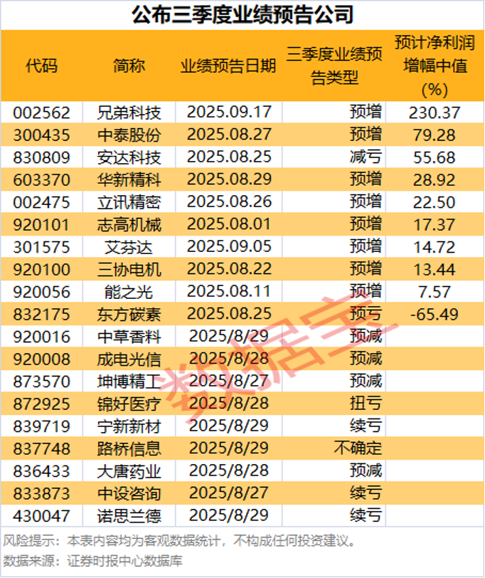 截至9月17日,共有近20家公司发布三季度业绩预告。以业绩预告类型统计,8家公司业绩预增,净利润增幅最大的是兄弟科技,其次是中泰股份。