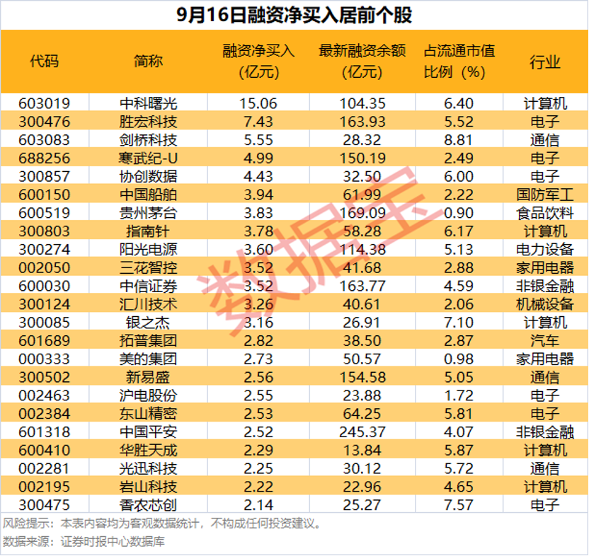 中科曙光融资净买入额居首,当日净买入15.06亿元;其次是胜宏科技、剑桥科技,融资净买入金额分别为7.43亿元、5.55亿元。融资净买入金额居前的还有寒武纪-U、协创数据、中国船舶等。
