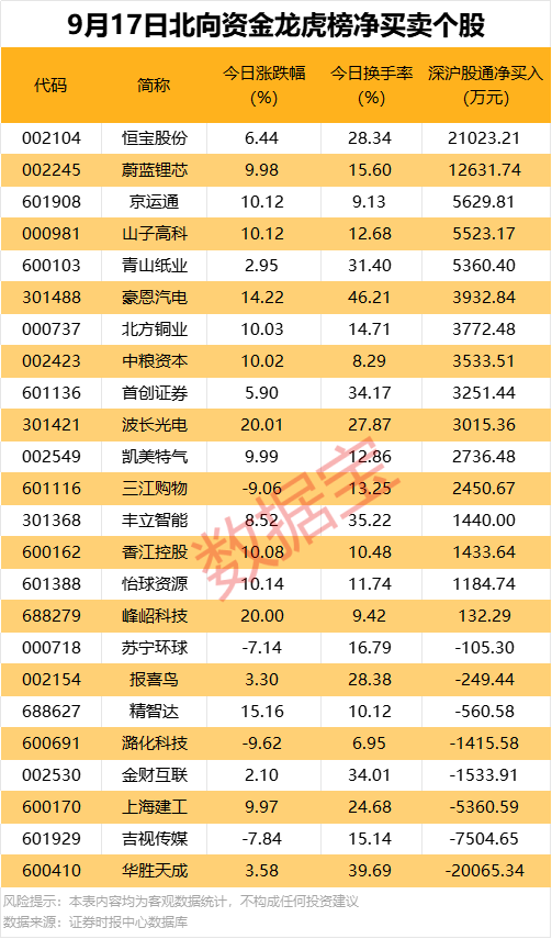 今日龙虎榜现身个股中,16股获北向资金净买入。净买入居首的是恒宝股份,金额为2.1亿元;蔚蓝锂芯、京运通、山子高科等均获净买入超5000万元。