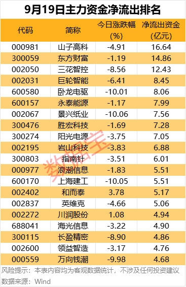 44股主力资金净流出超3亿元,9股净流出金额超7亿元。其中,山子高科、东方财富、三花智控净流出金额均超10亿元,巨轮智能、卧龙电驱、永泰能源、景兴纸业、胜宏科技、阳光电源等净流出也居前。