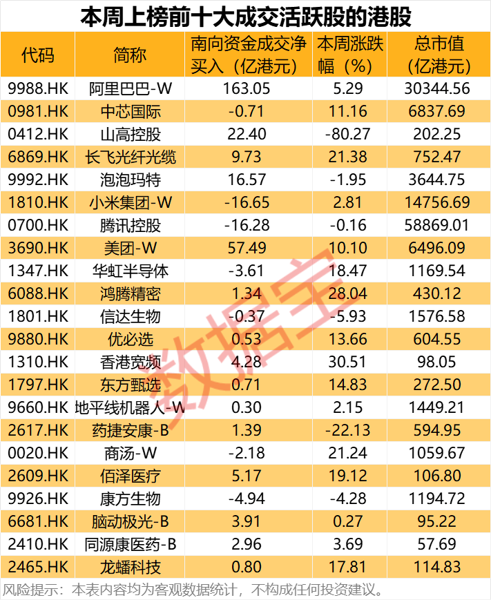 从行情看,前十大活跃个股中,香港宽频本周涨幅最高,累计涨幅达到30.51%,鸿腾精密、长飞光纤光缆、商汤-W紧随其后,分别达到28.04%、21.38%、21.24%。