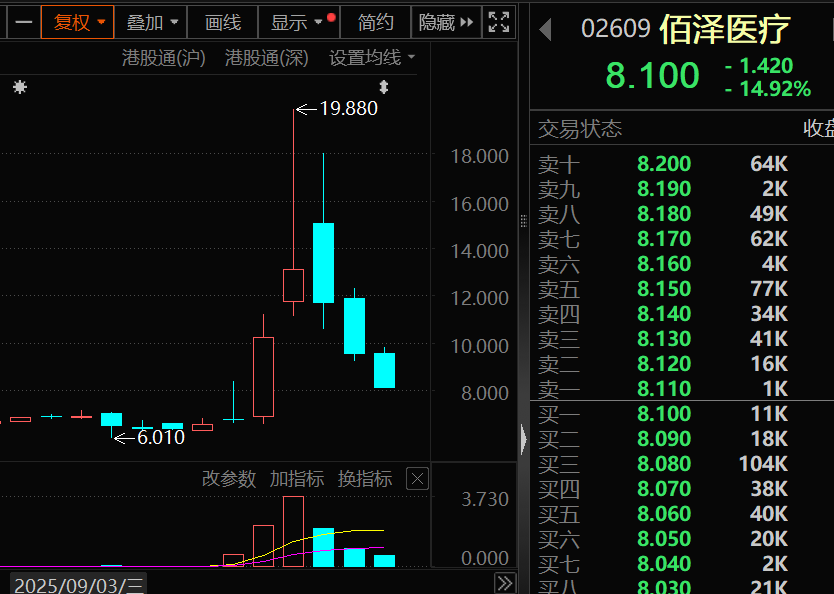 佰泽医疗为今年6月23日上市的港股次新股,本周股价大幅波动,周一、周二分别上涨50.59%、28.03%,其中周二当日振幅达到85.55%,周三开始连续下跌,累计跌幅达到38.22%,最新价较周二高点跌去近60%。与近期股价大幅波动的药捷安康-B类似,佰泽医疗自9月8日开始被纳入港股通标的,随后股价波动幅度明显加大。