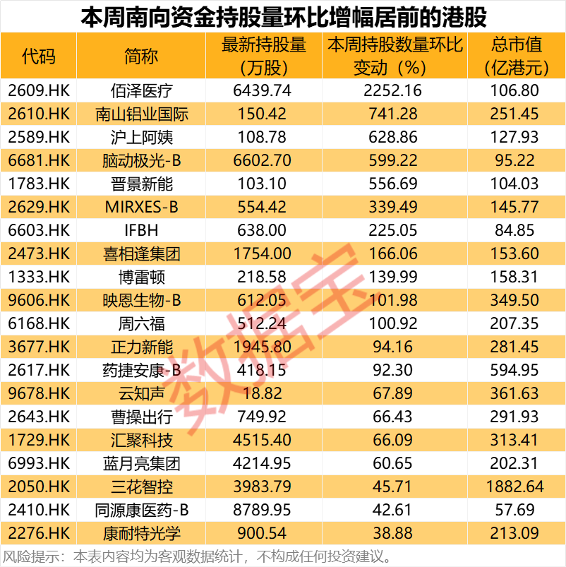 从持股量变化来看,本周11股获南向资金持股量环比增长超100%,佰泽医疗居首,环比增长2252.16%,南山铝业国际、沪上阿姨、脑动极光-B、晋景新能持股量环比增长500%以上。