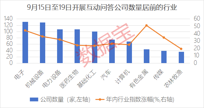 电子行业共有超过130家公司开展互动问答,截至9月19日,申万一级电子行业指数年内涨幅超过44%,涨幅位居行业前三,互动问答涉及的关键词主要包括芯片、机器人、固态电池等。
