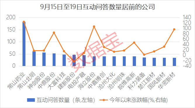 市场表现方面,整体来看,截至9月19日,本周获投资者关注的公司年内平均涨幅超过30%,大幅跑赢同期沪深300指数,关注度较高的公司市场表现更为强势。互动问答超过50条的公司,年内平均涨幅最高,超过60%,常山药业、中鼎股份年内涨幅均超过80%,互动问答为1~3条的公司,平均涨幅低于33%。