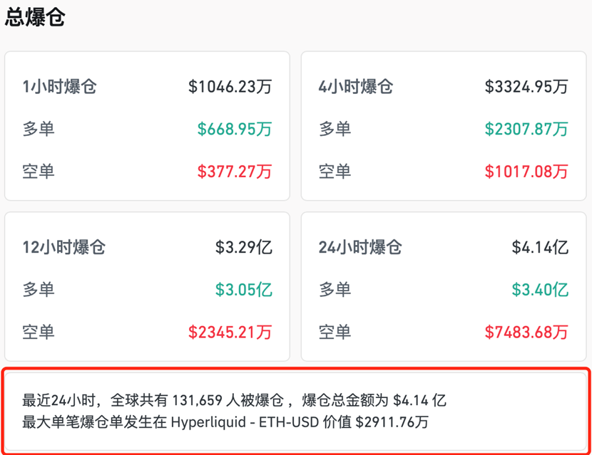 其他主流加密货币亦全线下挫,比特币一度跌近2%,艾达币、FIL价格均跌超3%,SOL、狗狗币跌超2%,整个加密货币市场一度蒸发超1400亿美元市值。Coinglass显示,近24小时全球共有超过13万人被爆仓,爆仓总金额达4.14亿美元(约合人民币29亿元)。