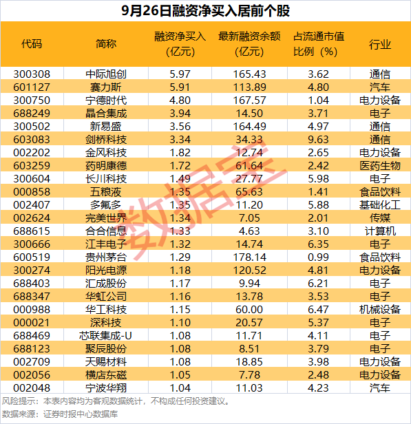 具体到个股,9月26日获融资净买入千万元以上的有373只,其中25只融资净买入均超亿元。中际旭创融资净买入额居首,当日净买入5.97亿元,其次是赛力斯、宁德时代,融资净买入金额分别为5.91亿元、4.80亿元,融资净买入金额居前的还有晶合集成、新易盛、剑桥科技等。