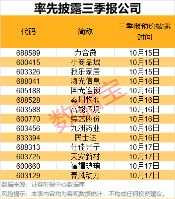 上交所率先披露三季报的是力合微、小商品城、我乐家居,将于10月15日公布三季报,北交所最先公布三季报的是民士达,将于10月16日披露三季报,其次是宁新新材,将于10月20日披露三季报。