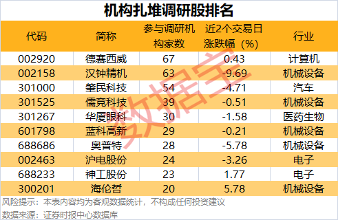 近两个交易日(9月25日至9月26日)共有76家公司公告机构调研记录。其中,10家公司获不低于20家机构扎堆调研,德赛西威、汉钟精机、肇民科技均有超50家机构调研。