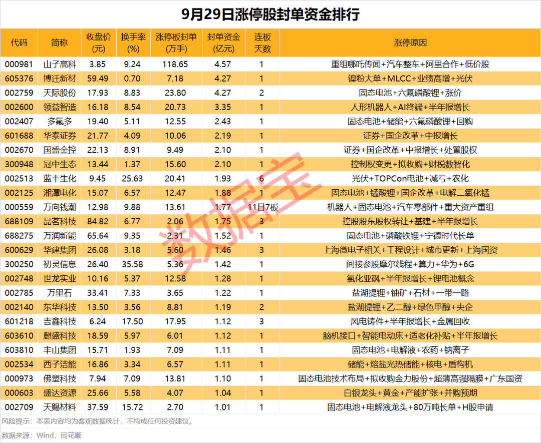 据证券时报·数据宝统计,9月29日,从收盘涨停板封单量看,山子高科居首,高达118.65万手;天际股份、领益智造、蓝丰生化随后,封单量均在20万手以上。