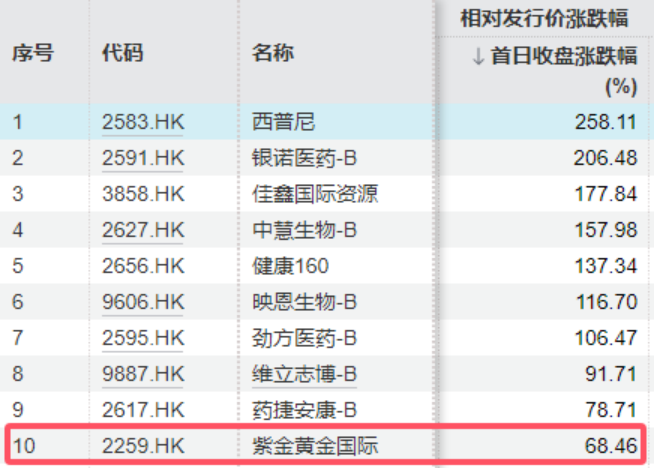 值得注意的是,紫金黄金国际上市首日收盘价较发行价上涨68.46%,这一涨幅位列今年港股新股首日涨幅的第10名,其总市值也突破3000亿港元。