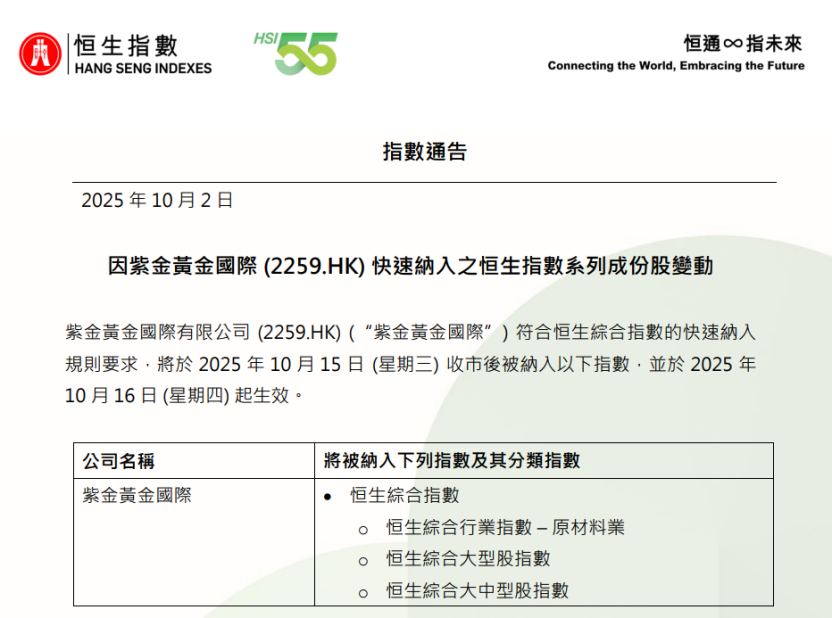而更快的是紫金黄金国际的“入指”速度,在上市的第二个交易日(10月2日),紫金黄金国际又再获重大利好。当天,恒生指数公司发布公告,紫金黄金国际符合恒生综合指数的快速纳入规则要求,将于2025 10月15日(星期三)收市后被纳入恒生综合指数、恒生综合行业指数—原材料业、恒生综合大型股指数以及恒生综合大中型股指数,并于2025 10月16日(星期四)起生效。