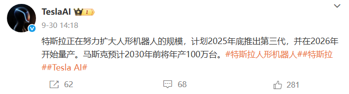 9月30日,“TeslaAI”再发文,特斯拉正在努力扩大人形机器人的规模,计划2025年底推出第三代,并在2026年开始量产。马斯克预计2030年前将年产100万台。