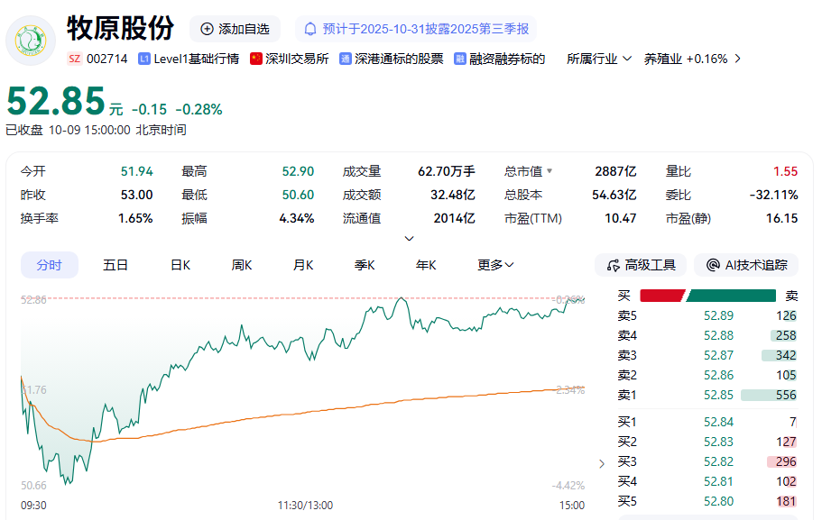 截至10月9日收盘,牧原股份股价报52.85元,总市值2887亿元。