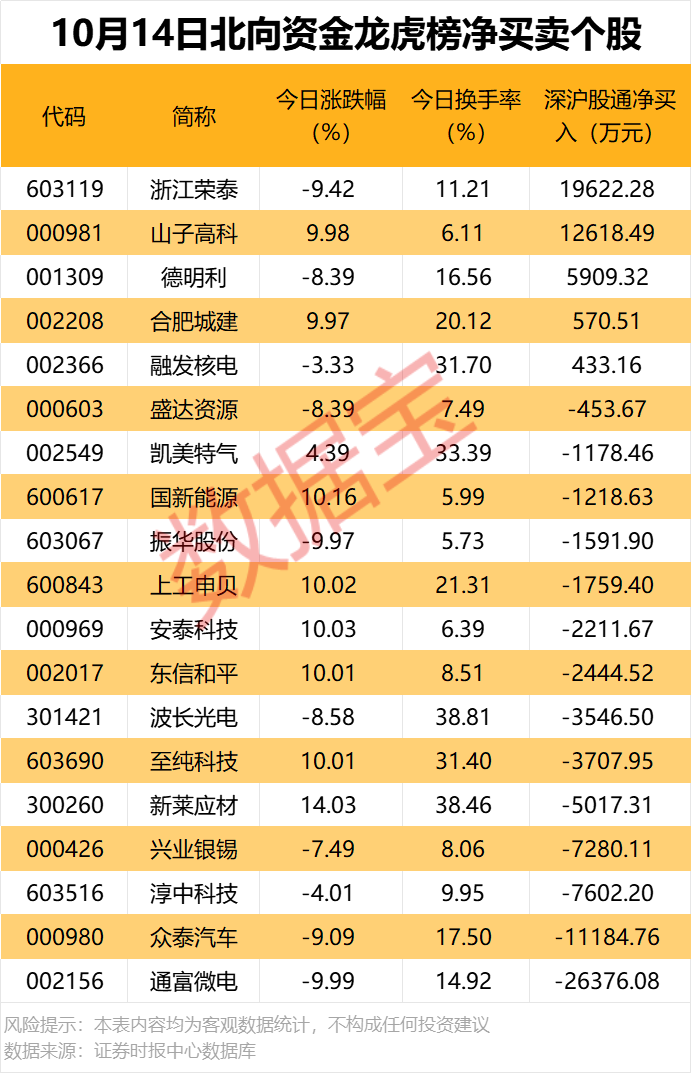 今日龙虎榜现身个股中,5股获北向资金净买入。净买入居前的是浙江荣泰、山子高科,金额分别为1.96亿元、1.26亿元。