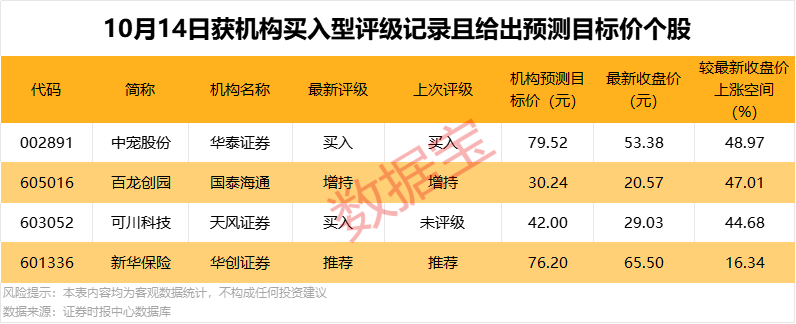 业绩方面,机构评级买入个股中,公布三季度业绩预告的共有5只,以净利润增幅中值来看,净利润增幅最高的是全志科技,公司预计三季度净利润同比增长82.13%;其次是越秀资本、新华保险等,预计净利润增幅中值分别为75%、55%。