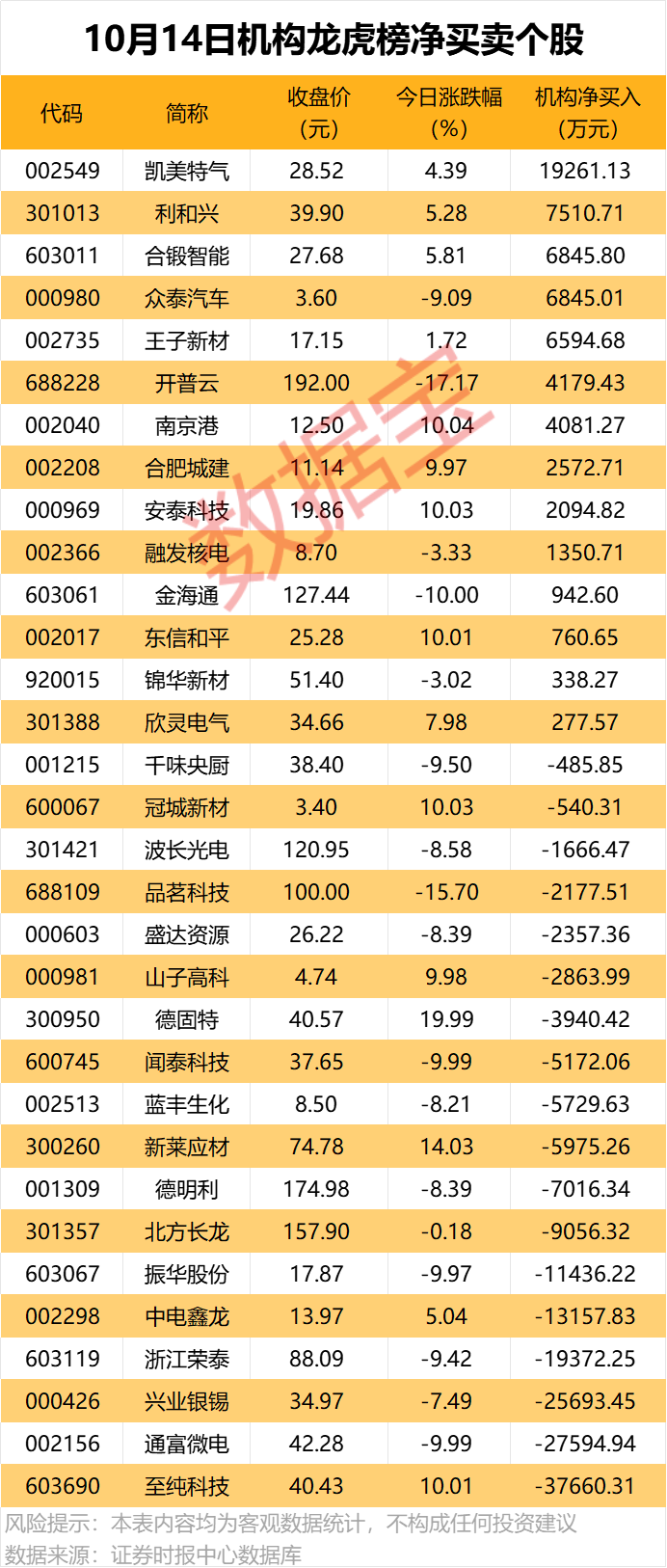 今日龙虎榜中,净买入的个股14只,净卖出的个股18只。其中凯美特气获机构净买入1.93亿元;利和兴、合锻智能、众泰汽车、王子新材获机构净买入均超6000万元。