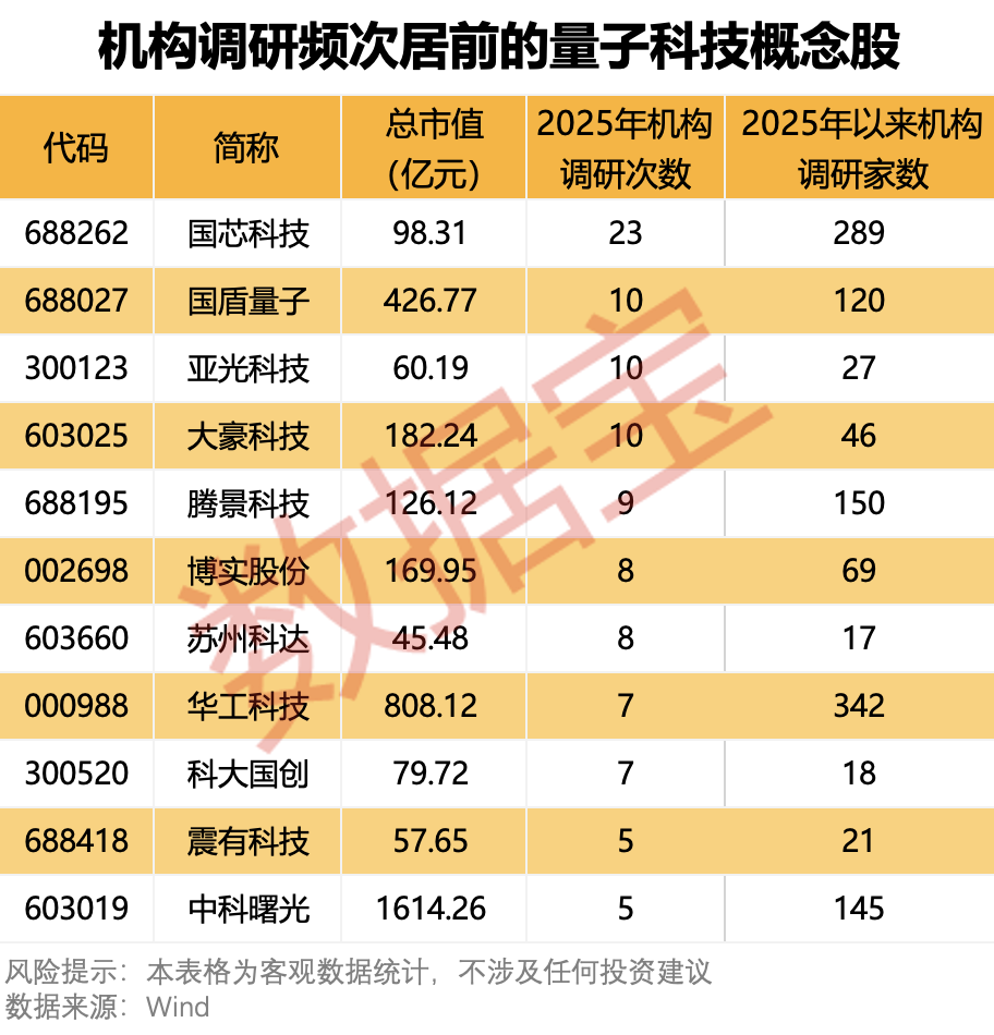 不少概念股今年以来持续获得机构青睐。今年以来共11股年内获得机构调研5次及以上,包括国芯科技、国盾量子、亚光科技、大豪科技和腾景科技等。