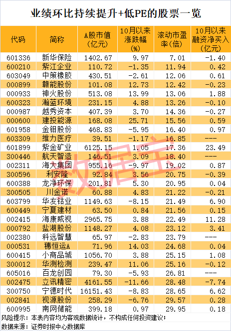 资金面上,近期部分业绩环比持续提升的低市盈率股票获得融资客加仓。数据宝统计,截至10月20日收盘,10月以来融资净买入超1亿元的有7只,分别为紫金矿业、海康威视、华友钴业、宁德时代、盐湖股份、神火股份、小商品城。紫金矿业融资净买入额23.49亿元,排在第一位。